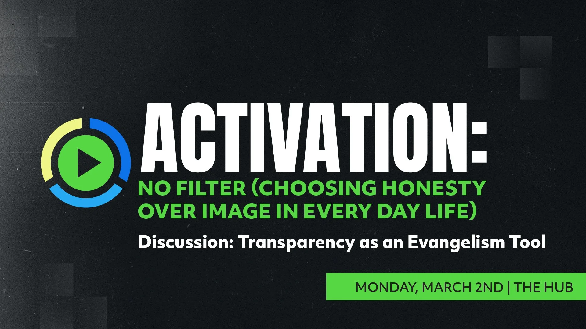 Activation is a space to abide, learn, and grow. These events will feature a specific spiritual discipline, and includes worship, teaching, and interactive engagement. This month's topic is: No Filter (Choosing Honesty Over Image In Every Day Life) with a discussion on transparency as an evangelism tool.